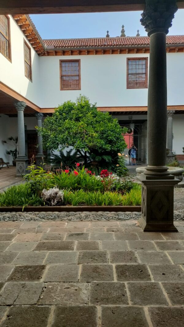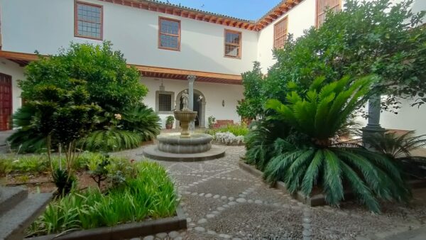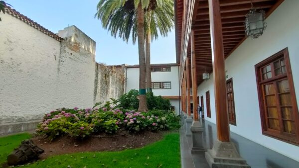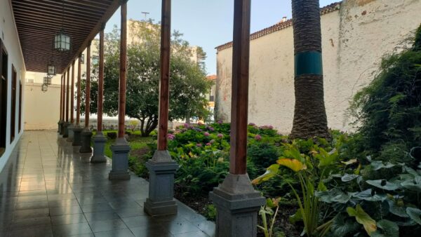 Los jardines de la Casa del Obispo son un rincón poco conocido que aporta serenidad y belleza al conjunto del palacio. Tras la solemne fachada barroca se abre un espacio íntimo, ajardinado con especies ornamentales y árboles que aportan frescor y sombra, donde el visitante puede percibir el contraste entre la monumentalidad de la piedra y la delicadeza de la naturaleza. Estos jardines, que han sido cuidados y renovados tras la reconstrucción del edificio, no solo cumplen una función estética, sino que evocan el estilo de los patios canarios, concebidos como espacios de convivencia, contemplación y recogimiento. En ellos se funden la historia y la calma, convirtiéndose en un refugio silencioso dentro del bullicio del casco histórico de La Laguna.
